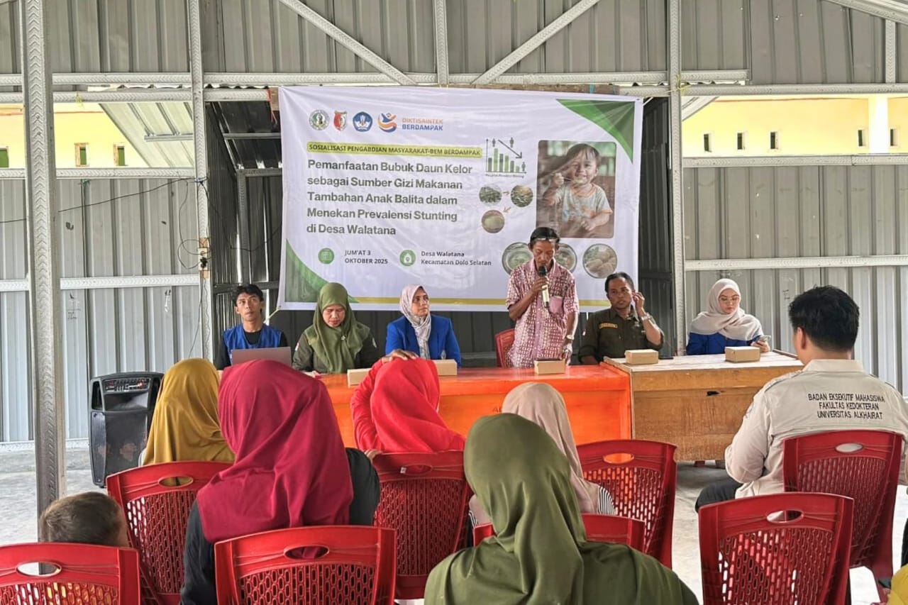 SIGI – Tim Hibah Pengabdian MasyarakatโBEM Berdampak Universitas Alkhairaat (UNISA) Palu, melaksanakan kegiatan sosialisasi program pemanfaatan bubuk daun kelor, sebagai sumber gizi makanan tambahan anak balita, dalam menekan prevalensi stunting di Desa Walatana, belum lama ini.