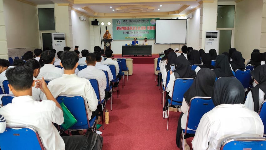 PALU – Rektor Universitas Alkhairaat (Unisa), Dr. Muhammad Yasin, memberikan pembekalan kepada mahasiswa Kuliah Kerja Nyata (KKN), angkatan ke-57, di Aula Fakultas Agama Islam (FAI), Sabtu (18/04).
