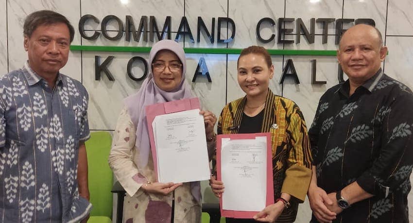 Serah terima website dilakukan oleh Kepala Diskominfosantik, Ridwan Karim, kepada Sekretaris DPPKB Kota Palu, Yuyun Yotomaruangi.