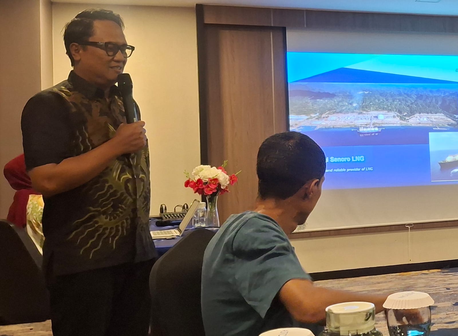 PALU- Corporate Communication Manager DSLNG Adhika Paramanandana, memaparkan keberadaan Proyek LNG DSLNG, di Luwuk Sulawesi Tengah (Sulteng) serta kapasitas produksinya 2 juta ton pertahun.