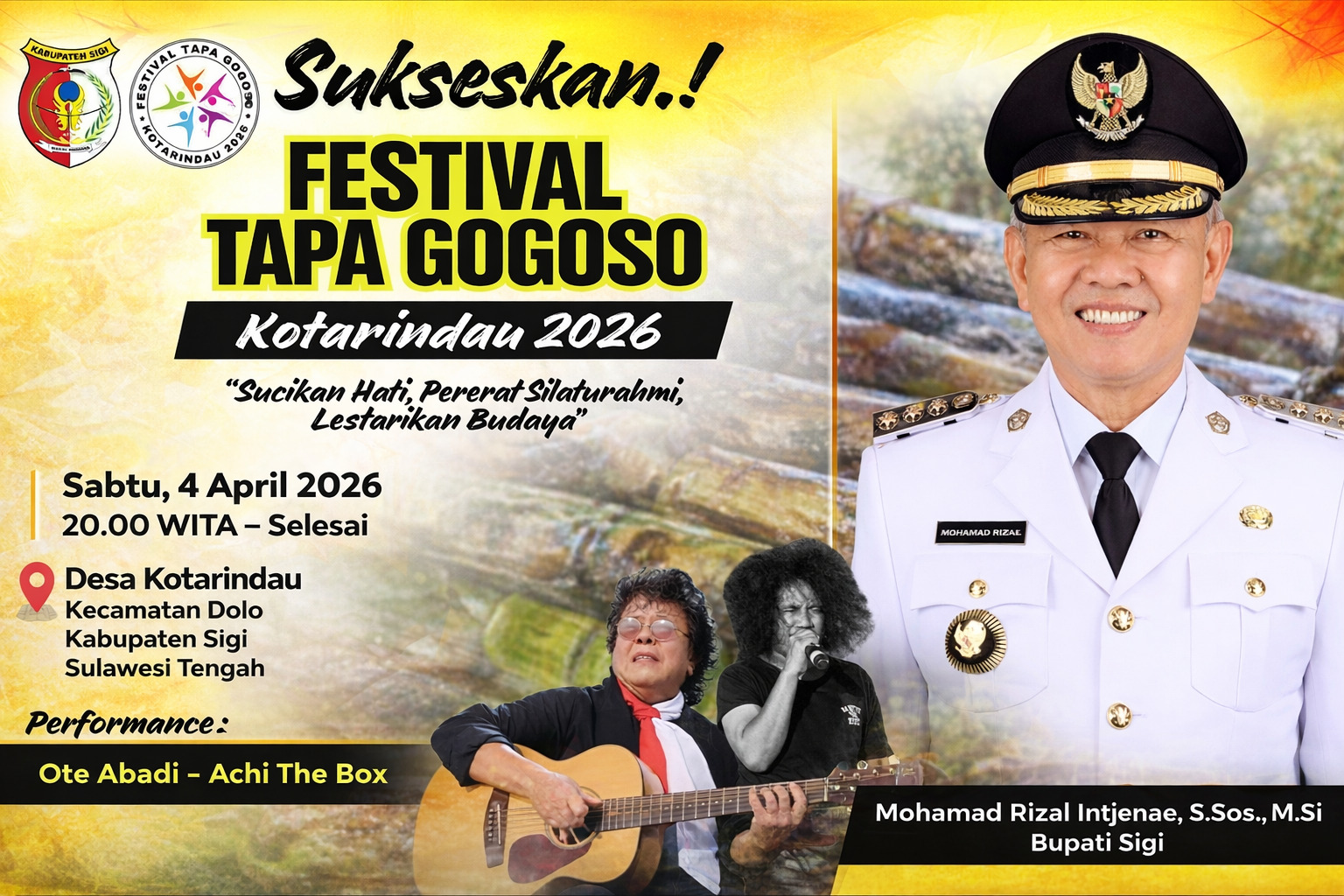SIGI – Festival Tapa Gogoso Kotarindau 2026 siap digelar sebagai upaya melestarikan budaya lokal sekaligus mempererat tali silaturahmi masyarakat. Kegiatan ini akan berlangsung pada Sabtu, 4 April 2026, mulai pukul 20.00 WITA hingga selesai, bertempat di Desa Kotarindau, Kecamatan Dolo, Kabupaten Sigi, Sulawesi Tengah.