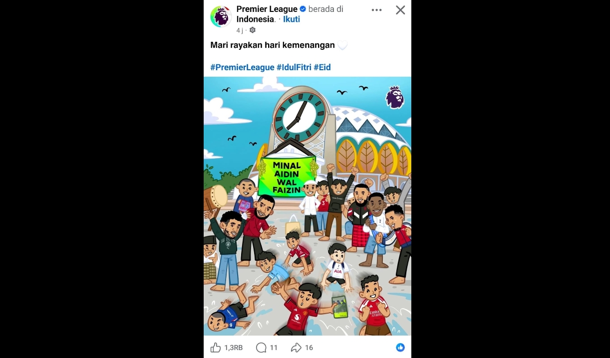 PALU – Masyarakat Sulawesi Tengah berbangga desain poster atau flyer ucapan Idul Fitri bertema sepak bola yang diunggah akun Premier League menuai perhatian publik, khususnya warga Kota Palu.