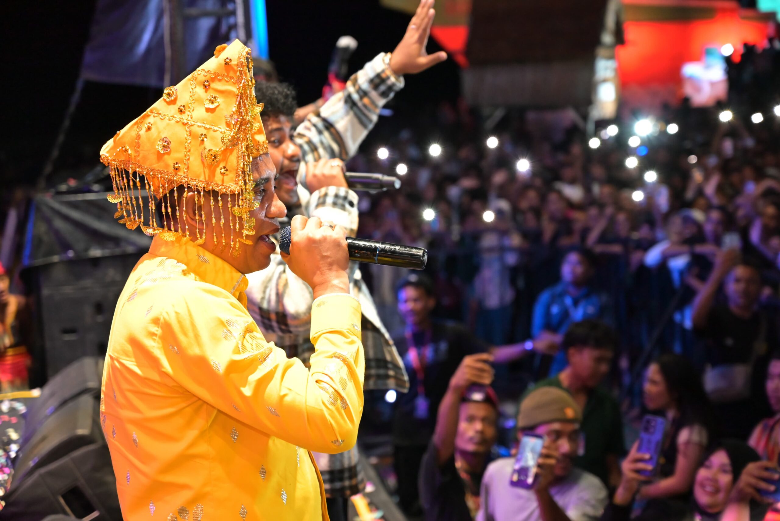 Kemeriahan semakin terasa ketika artis Justy Aldrin naik ke panggung membawakan tembang populernya, “Hilang”. Suasana bertambah hidup saat Gubernur Sulawesi Tengah turut bernyanyi bersama, menciptakan momen yang memukau dan disambut riuh tepuk tangan ribuan penonton. Kolaborasi tersebut menjadikan malam pembukaan Festival Teluk Tomini 2025 semakin meriah dan penuh kehangatan.