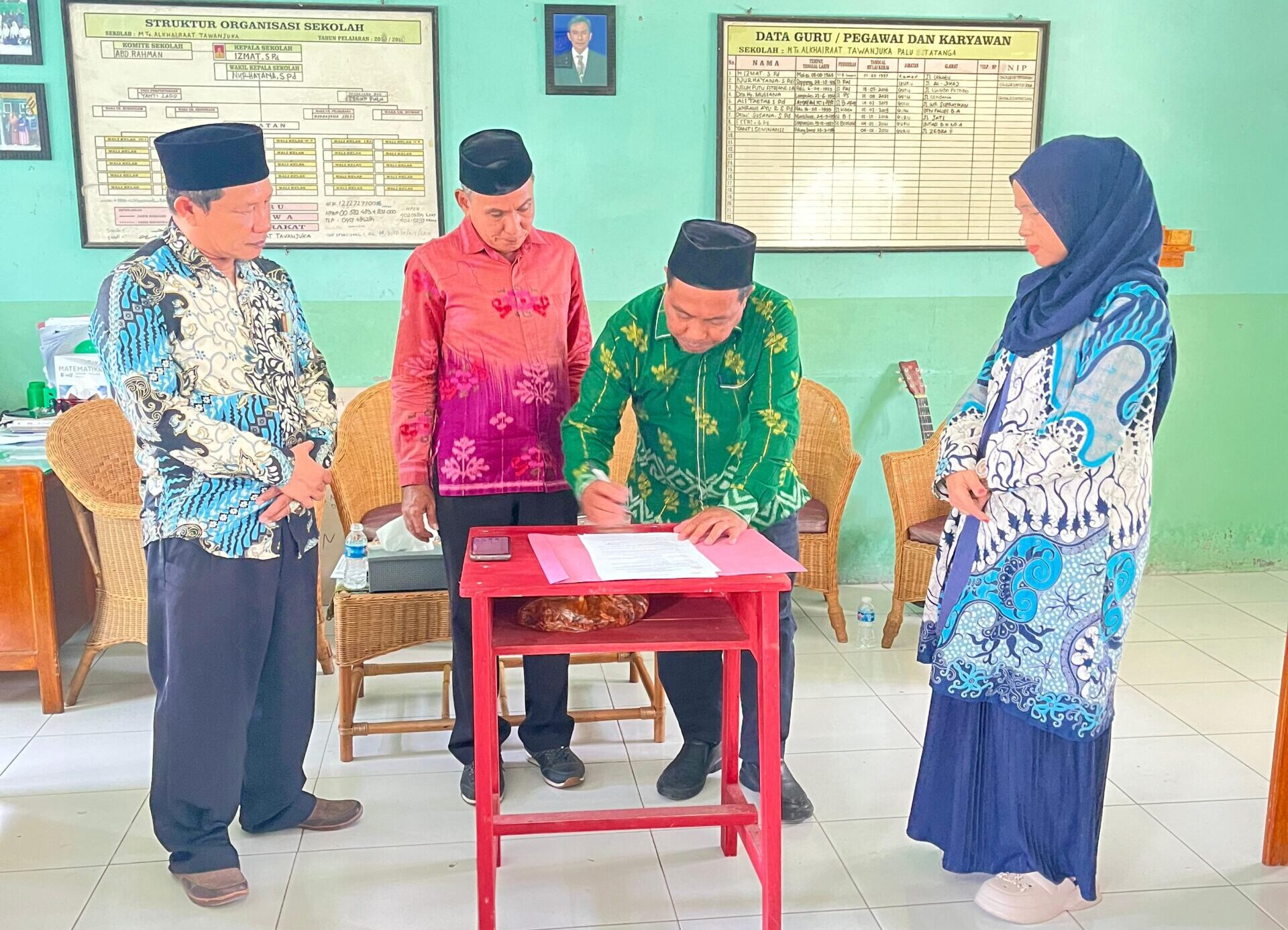 Kunjungan tersebut juga dihadiri Kepala Madrasah (Kamad) yang baru dilantik, Ustadz Aswin Darise. Dalam kesempatan itu dilakukan penandatanganan serah terima inventaris madrasah dari Kamad lama kepada Kamad baru.