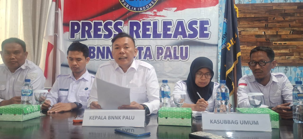 Demikian pemaparan Kepala Badan Narkotika Nasional (BNN) Kota Palu, Komisaris Besar Polisi Qori Wicaksono, didampingi jajarannya, Katim Pencegahan, Pelman, Katim Pemberantasan Fikri (kanan), Kasubag Umum Nuraiman, Katim Dayamas Yamin Patra dalam konferensi pers di Kantor BNNK Palu, Jalan Diponegoro, Kota Palu, Senin.