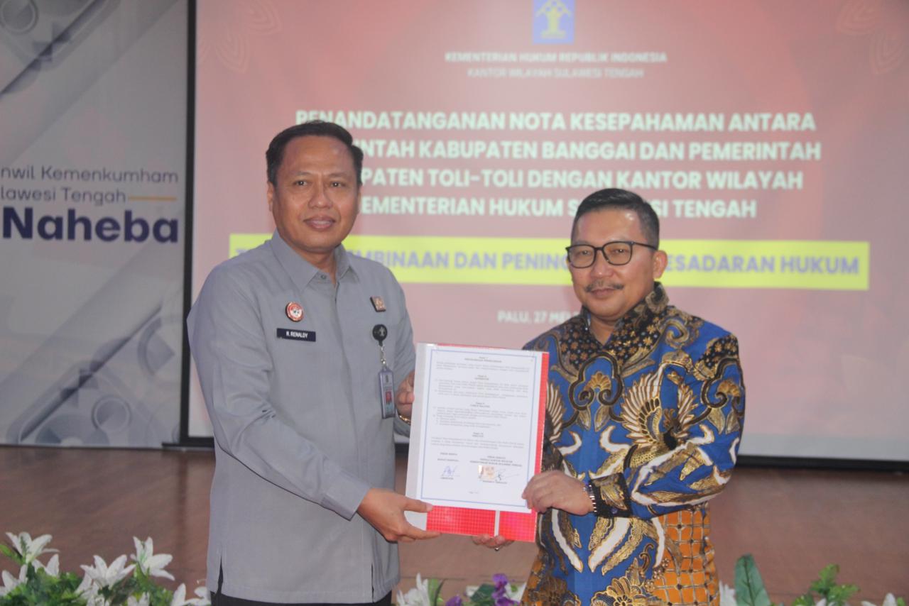Komitmen tersebut diwujudkan melalui penandatanganan Nota Kesepahaman (MoU) antara Kepala Kanwil Kemenkum Sulteng, Rakhmat Renaldy, dengan Bupati Banggai, Amirudin Tamoreka, dan Bupati Toli-Toli, Amran Yahya, yang berlangsung di Ruang Garuda Kanwil Kemenkum Sulteng, Jalan Dewi Sartika, Kota Palu, Selasa (27/5)