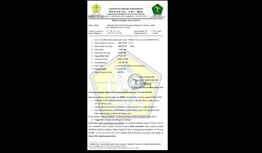 PALU — Lajnah Falakiyah Alkhairaat Madinatul Ilmi Dolo Kabupaten Sigi merilis hasil hisab awal bulan Syawal 1447 Hijriah yang dilakukan di Gedung Observasi Hilal Kementerian Agama Sulawesi Tengah, Desa Marana, Kecamatan Sindue, Kabupaten Donggala. Rilis tersebut ditandatangani Ketua Lajnah Falakiyah, M. Muhammad Syarief Hidayatullah, diinformasikan pada Sabtu (14/3).