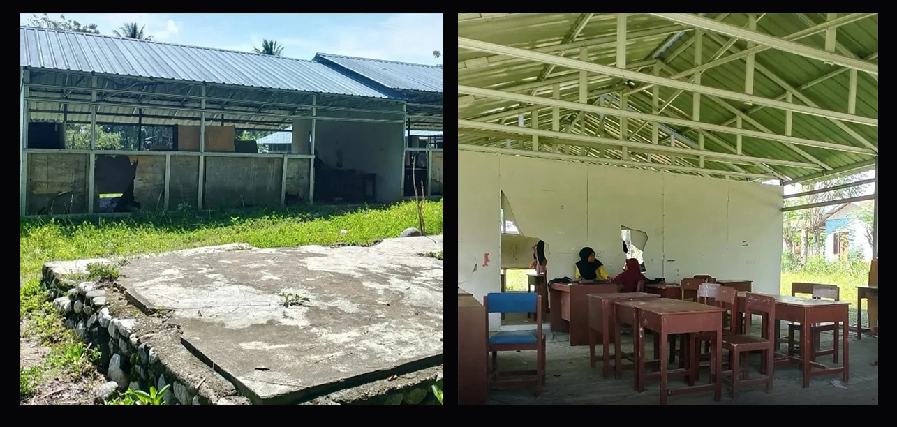 Bangunan yang seharusnya menjadi ruang aman dan nyaman bagi siswa, tampak rusak parah. Dinding-dinding berlubang, beberapa bagian lapuk, dan fasilitas belajar sangat terbatas. Dalam kondisi tersebut, proses belajar mengajar tetap berlangsung dengan segala keterbatasan demi mencerdaskan anak bangsa.