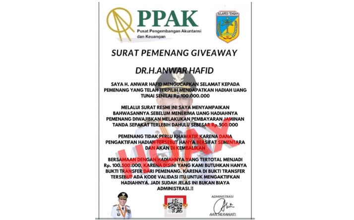 Unggahan yang menampilkan logo Pusat Pengembangan Akuntansi dan Keuangan (PPAK) serta logo Pemerintah Provinsi Sulawesi Tengah itu diduga kuat merupakan modus penipuan. Pelaku memanfaatkan nama gubernur untuk meyakinkan calon korban agar mentransfer sejumlah dana dengan dalih biaya pengaktifan hadiah.