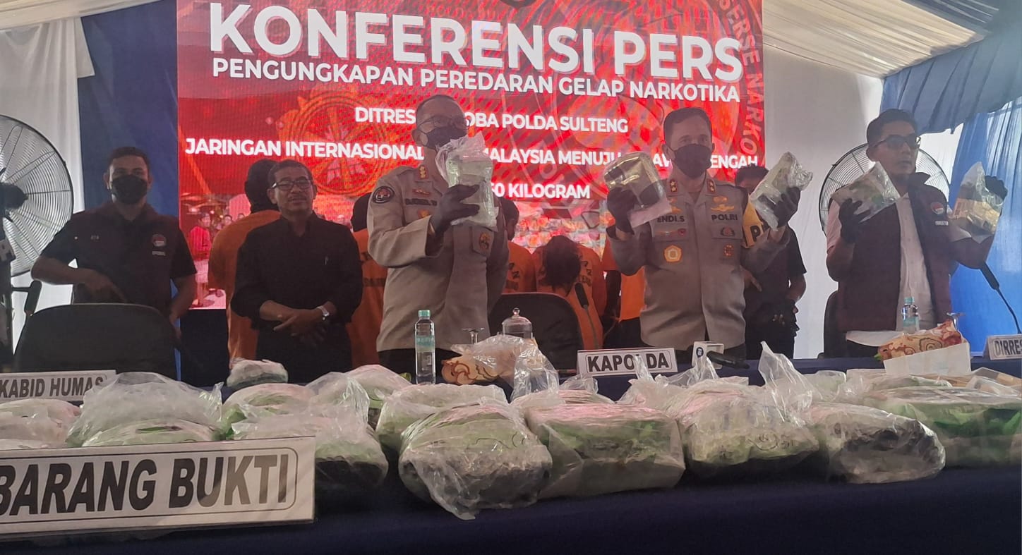 PALU- Kepolisian Daerah (Polda) Sulawesi tengah menggagalkan penyelundupan peredaran narkotika jenis sabu jaringan internasional dari negeri jiran Malaysia masuk melewati perairan Donggala, Provinsi Sulawesi Tengah (Sulteng), dengan 60 paket, dibungkus kemasan teh cina berwarna hijau dan kuning seberat 60 kilogram, masing-masing satu kemasan 1 kilo gram, di Jalan Trans Palu-Toli-toli, Kabupaten Donggala, 13 November 2025.
