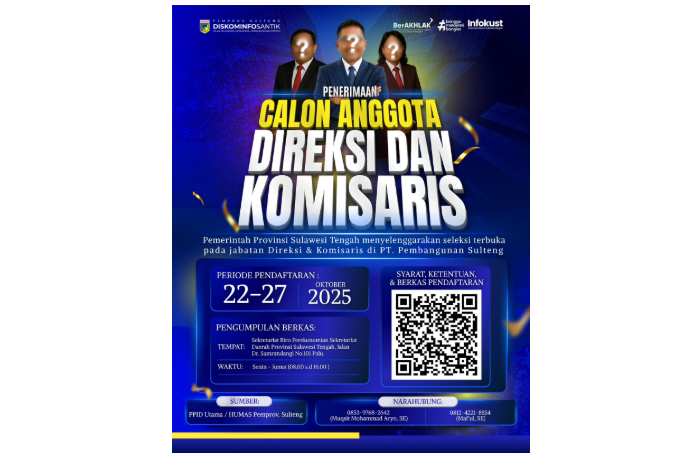 Palu – Pemerintah Provinsi Sulawesi Tengah melalui Panitia Seleksi (Pansel) secara resmi mengumumkan pembukaan seleksi terbuka calon Anggota Direksi dan Komisaris PT. Pembangunan Sulteng Tahun 2025. Pembukaan seleksi ini tertuang dalam Pengumuman Nomor: 01/Pansel-PTPS/2025 untuk jabatan Direksi, dan Nomor: 02/Pansel-PTPS/2025 untuk jabatan Komisaris.