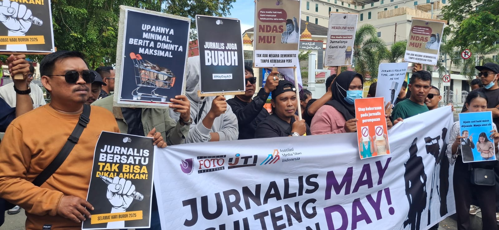 PALU- Sejumlah organisasi pers, terdiri dari Aliansi Jurnalis Independen (AJI) Kota Palu, Ikatan Jurnalis Televisi Indonesia (IJTI) Sulteng, Pewarta Foto Indonesia (PFI) dan Asosiasi Media Siber Indonesia (AMSI) Sulteng tergabung dalam Koalisi Roemah Jurnalis Sulawesi Tengah (KRJ-ST) dalam memperingati Hari Buruh Sedunia (May Day) yang jatuh pada 1 Mei dan Hari Kebebasan Pers Sedunia 3 Mei, ikut turun ke jalan melakukan aksi unjuk rasa.