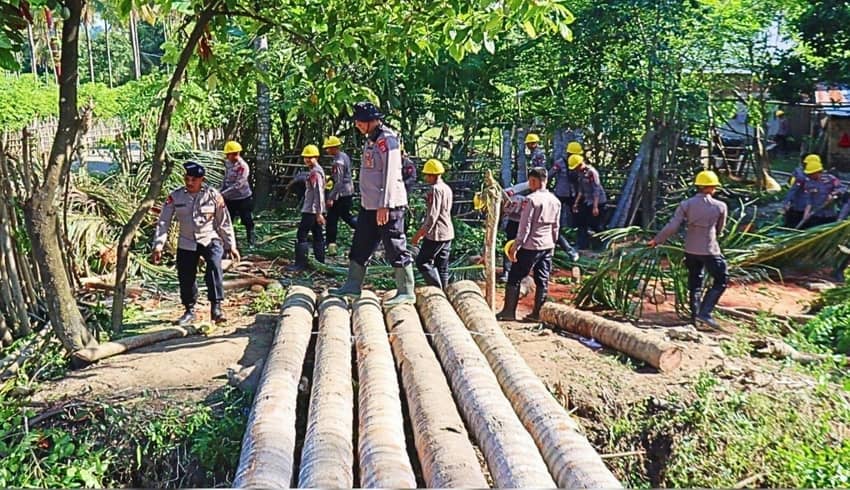 DONGGALA – Polres Donggala bersama satuan Brimob Polda Sulawesi Tengah (Sulteng), dan TNI bergotong royong membangun jembatan darurat untuk memulihkan akses transportasi yang terputus akibat bencana longsor dan banjir bandang.
