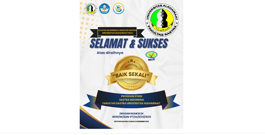 PALU – Dekan Fakultas Sastra Indonesia Universitas Alkhairaat (UNISA) Palu, Syamsuddin, menyampaikan, Program Studi Sastra Indonesia pada fakultas yang dipimpinnya, saat ini meraih predikat akreditasi “Baik Sekali” oleh Badan Akreditasi Nasional Perguruan Tinggi (BAN PT).