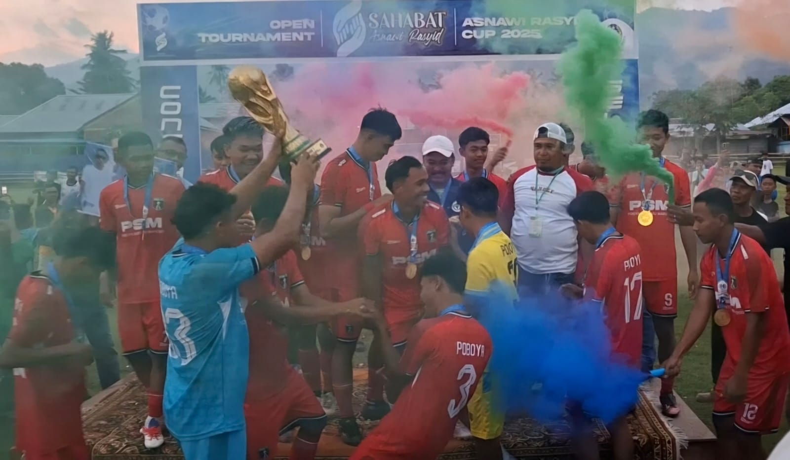 SIGI – Tim Poboya Sintuwu Maroso (PSM) berhasil menorehkan prestasi gemilang dengan menjuarai Open Turnamen Sepakbola Asnawi Rasyid Cup 2025 usai menundukkan Fajar Nusantara Langaleso dengan skor 3-1 pada partai final di Lapangan Bulava, Desa Sibalaya Utara, Kabupaten Sigi, Sabtu (11/10) sore.