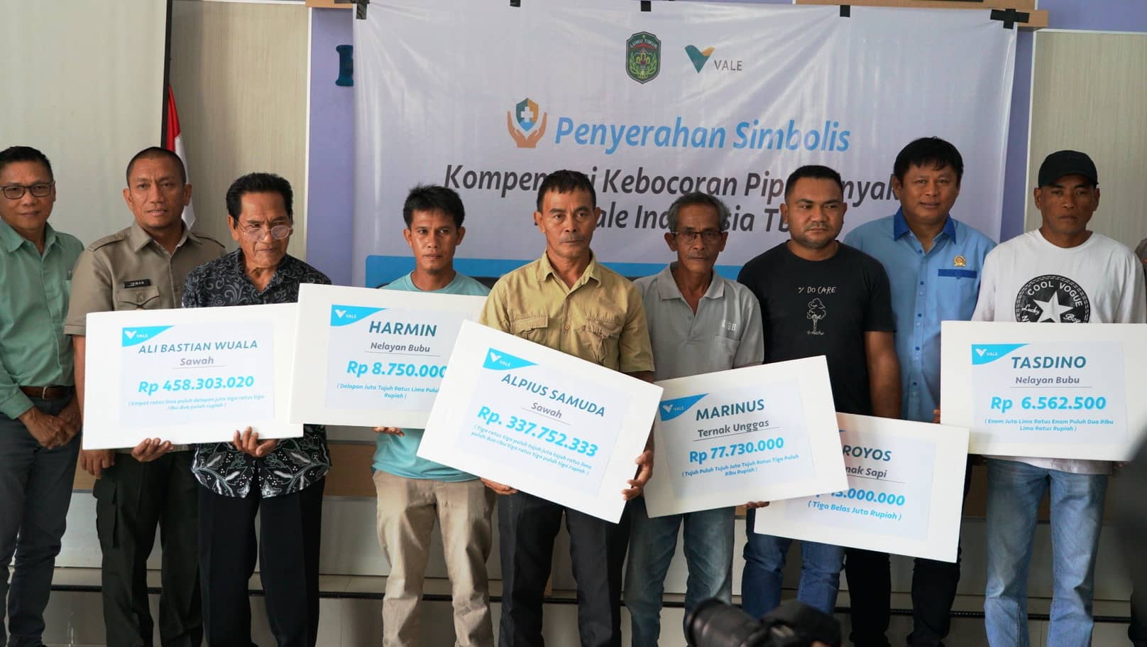 Kamis (02/10), kemarin, PT Vale Pemerintah Kabupaten (Pemkab) Luwu Timur, melaksanakan seremonial penyerahan secara simbolis dana kompensasi kepada masyarakat terdampak kebocoran pipa, di Aula Kantor Camat Towuti.