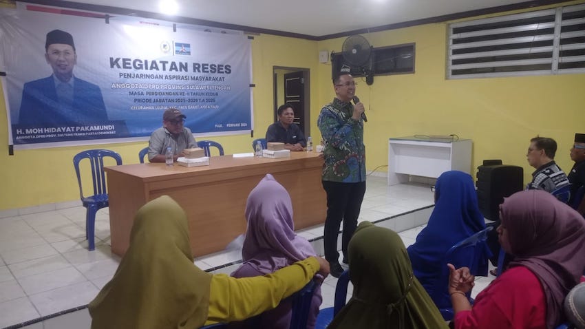 PALU – Anggota DPRD Provinsi Sulawesi Tengah (Sulteng) dari Partai Demokrat, Moh Hidayat Pakamundi, melaksanakan reses masa persidangan kedua tahun kedua, di Baruga Kelurahan Ujuna, Senin (16/02) malam.