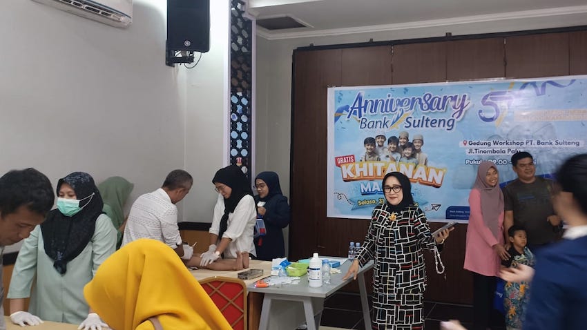 Salah satu kegiatan yang digelar adalah khitanan massal bagi sekitar 50 anak di workshop kantor Bank Sulteng, Jalan Tinombala, Palu, Selasa (31/3/2026). Program ini menjadi bagian dari agenda tahunan perusahaan dalam memperingati hari jadinya.