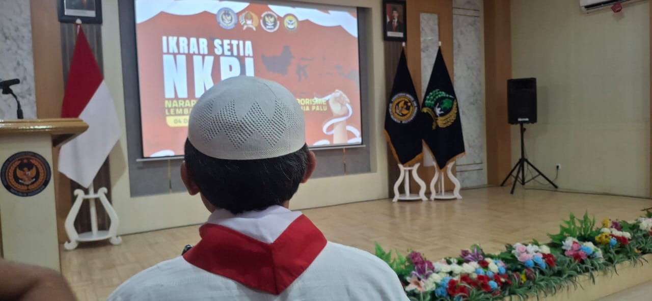 PALU – Ihsanuddin terpidana teroris membacakan pernyataan ikrar setia kepada Negara Kesatuan Republik Indonesia (NKRI), bertempat di Aula Lembaga Pemasyarakatan (Lapas) Kelas II Palu, Jalan Dewi Sartika,Kota Palu, Kamis.