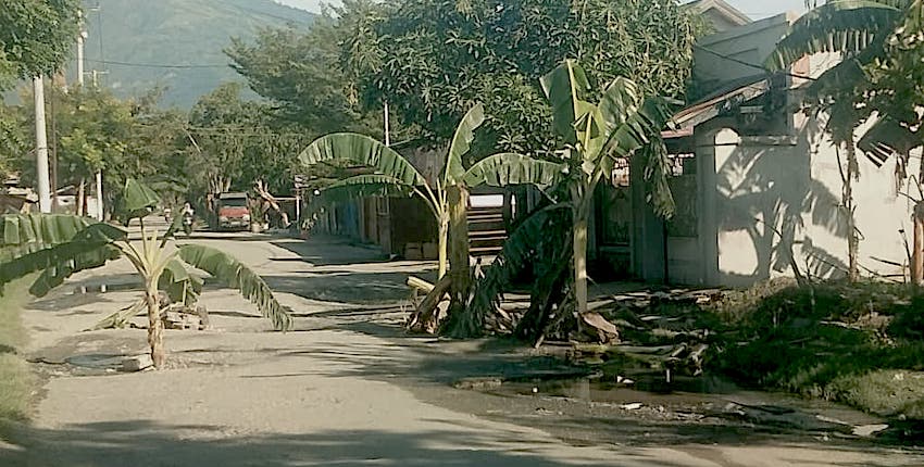 PALU – Warga Kelurahan Lere, Kecamatan Palu Barat, melakukan aksi penanaman pohon pisang di badan Jalan Lamotu, sebagai bentuk protes atas kerusakan jalan tersebut yang tak kunjung diperbaiki.